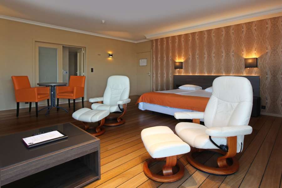 Grande chambre avec salle de bains complète et espace de repos. Terrasse d'angle avec vue sur la mer. Lit king-size et mobilier généreux.